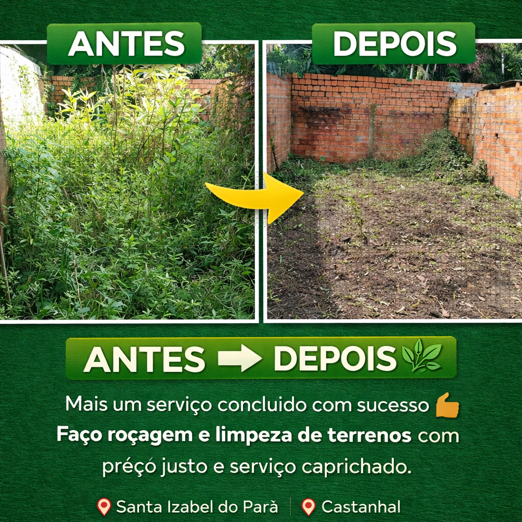 🌿 TERRENO LIMPO, VALORIZADO E SEGURO! 🚜✨ Cansado do mato alto e do perigo de bichos peçonhentos? Eu resolvo com agilidade e perfeição! ✅ O que eu ofereço: Roçagem profissional e limpeza detalhada. Acabamento impecável (cantos e beiradas). Prevenção contra focos de doenças e pragas. 💳 Facilidade: Aceito Pix e Cartão (parcelo se precisar). 📍 Região: Santa Izabel, Castanhal e Benevides. 📢 NÃO DEIXE O MATO TOMAR CONTA! Mande uma foto agora e receba seu orçamento sem compromisso. 👇 Chame no WhatsApp: 📲 (91) 98840-5144